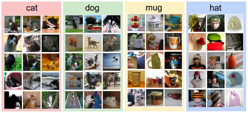 - A single image and assigns probabilities to 4 labels, {cat, dog, hat, mug}