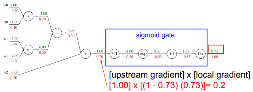 x = 3 # example values y = -4 # forward pass sigy = 1.0 / (1 + math.exp(-y)) # sigmoid in numerator #(1) num = x + sigy # numerator #(2) sigx = 1.0 / (1 + math.exp(-x)) # sigmoid in denominator #(3) xpy = x + y #(4) xpysqr = xpy**2 #(5) den = sigx + xpysqr # denominator #(6) invden = 1.0 / den #(7) f = num * invden # done! #(8)It contains multiple intermediate variables, each of which are only simple expressions for which we already know the local gradients.