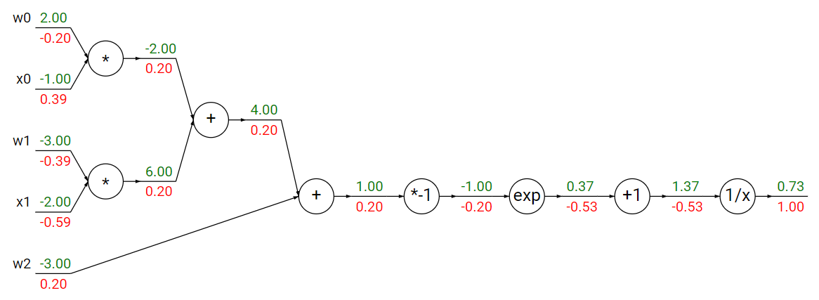 The real-valued "circuit" shows the visual representation of the computation. The forward pass computes values from inputs to output (shown in green). The backward pass then performs backpropagation which starts at the end and recursively applies the chain rule to compute the gradients (shown in red) all the way to the inputs of the circuit. The gradients can be thought of as flowing backwards through the circuit.