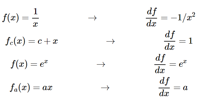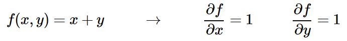 - Multiplication function of two numbers f(x, y)=xy (partial derivative for either input)