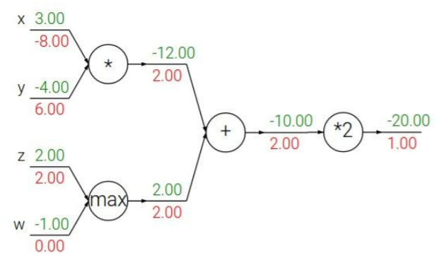 📌 Backpropagation can be thought of as gates communicating to each other (through the gradient signal) whether they want their outputs to increase or decrease (and how strongly), so as to make the final output value higher.
