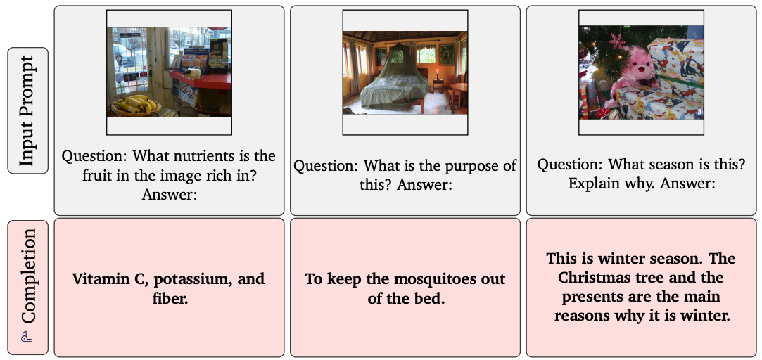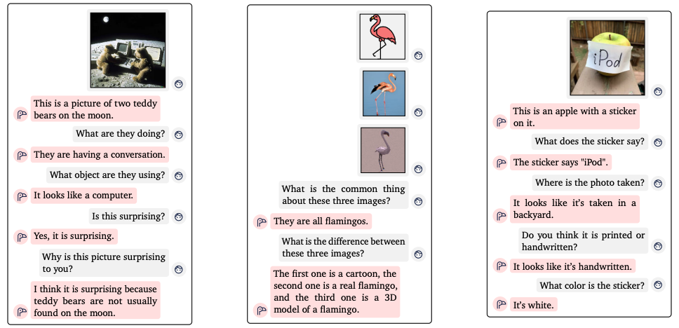가장 왼쪽 대화의 마지막 부분을 보면, 이 사진이 왜 놀랍냐는 질문에 'teddy bears는 보통 달에서 발견할 수 없기 때문'이라고 답합니다. teddy bear와 달의 일반적인 특징과 감정인 'surprising'의 의미도 이해해야 가능한 답변입니다.