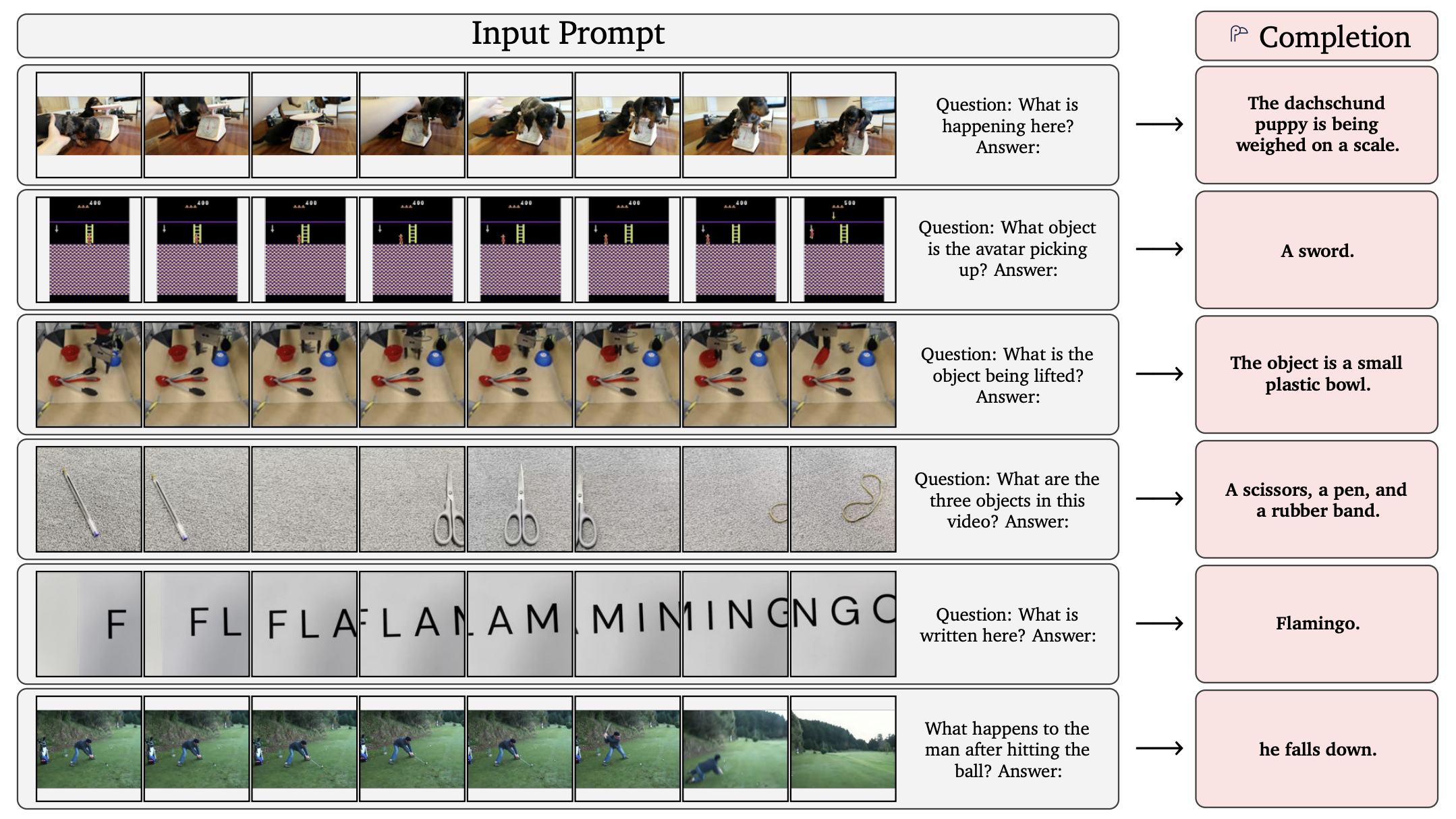 비디오에서 1FPS로 샘플링된 frame들과 질문을 input promt로 넣어줬을 때 Flamingo는 그에 대한 답을 생성합니다. 영상에서 어떤 객체가 있고, 어떤 일이 일어나고 있는지(체중계로 닥스훈트의 무게를 재는 것, 게임 속 아바타가 잡은 것이 검이라는 것) 파악하고, 한 frame에 나오지 않더라도 이를 인지(각각 따로 나오는 펜, 가위, 고무줄을 식별, 따로 나오는 글자를 식별) 합니다.