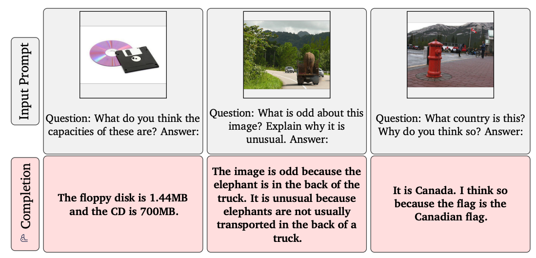input prompt로 어떤 예제를 넣어주었는지와 그 예제들을 바탕으로 완성한 문장이 어떤 것인지 보여줍니다. 몇 개의 예제만 보고(few-shot) 그 예제의 형식에 맞춰 문장을 완성한 것을 볼 수 있습니다. (예제를 하나하나 곱씹어 보면 단순히 이미지를 잘 분류하거나 문장을 그럴듯하게 완성하는 것이 아니라, 정말로 세상을 이해하고 있는 듯한 느낌을 줍니다. 이미지와 문장 속에 있는 객체, 관계, 속성 등에 대한 이해를 바탕으로 답을 도출한 것을 확인할 수 있습니다.) 잊지 말아야 할 점은 하나의 모델로 다양한 task에서 few-shot 했을 때의 결과라는 것입니다.