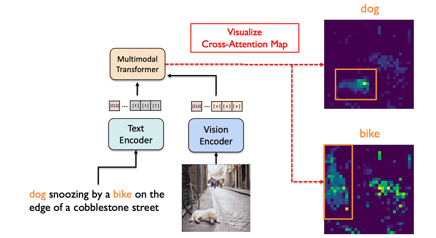 Vision-Language(VL)에 대한 학습이 잘 이루어졌다면, 문장의 각 단어와 이미지 내 객체 사이의 alignment 정보를 cross-attention map이 담고 있을 것이라는 가설을 세웠습니다. 그리고 COCO 데이터셋의 텍스트-이미지 쌍 데이터에 대해 ALBEF 모델의 cross-attention map을 시각화한 결과, 다소 noisy 하지만 단어와 객체 사이의 상관관계를 파악할 수 있었습니다.