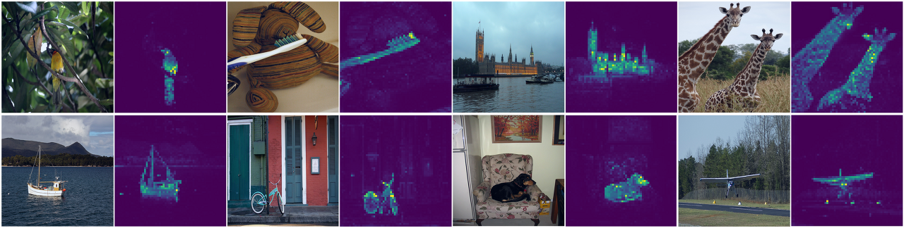 최근 Vision Transformer를 self-supervised로 학습하는 방법들이 활발히 연구되고 있습니다. DINO는 그중 하나로 제안한 방법으로 학습한 모델의 self-attention map을 시각화한 결과, 이미지 속 객체를 뚜렷하게 구분하는 것을 확인했습니다. Semantic segmentation 정보를 주지 않았음에도, 아래와 같이 객체를 잘 구분해 많은 관심을 받았습니다.